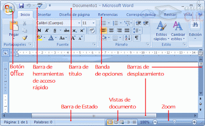 Barra de titulo: como su nombre lo indica permite visualizar el titulo el cual esta compuesto por dos títulos que corresponden al el nombre del programa y nombre del documento que se encuentre abierto.Banda de opciones: esta banda remplazo a la barra de menú de las versiones anteriores a MS OFFICE, pero cum ple con su misma tarea, la cual es proporcionar el acceso a todas las acciones aplicables para la aplicación de office que se encuentre activa, agrupada por operaciones y de visualmente intuitivo